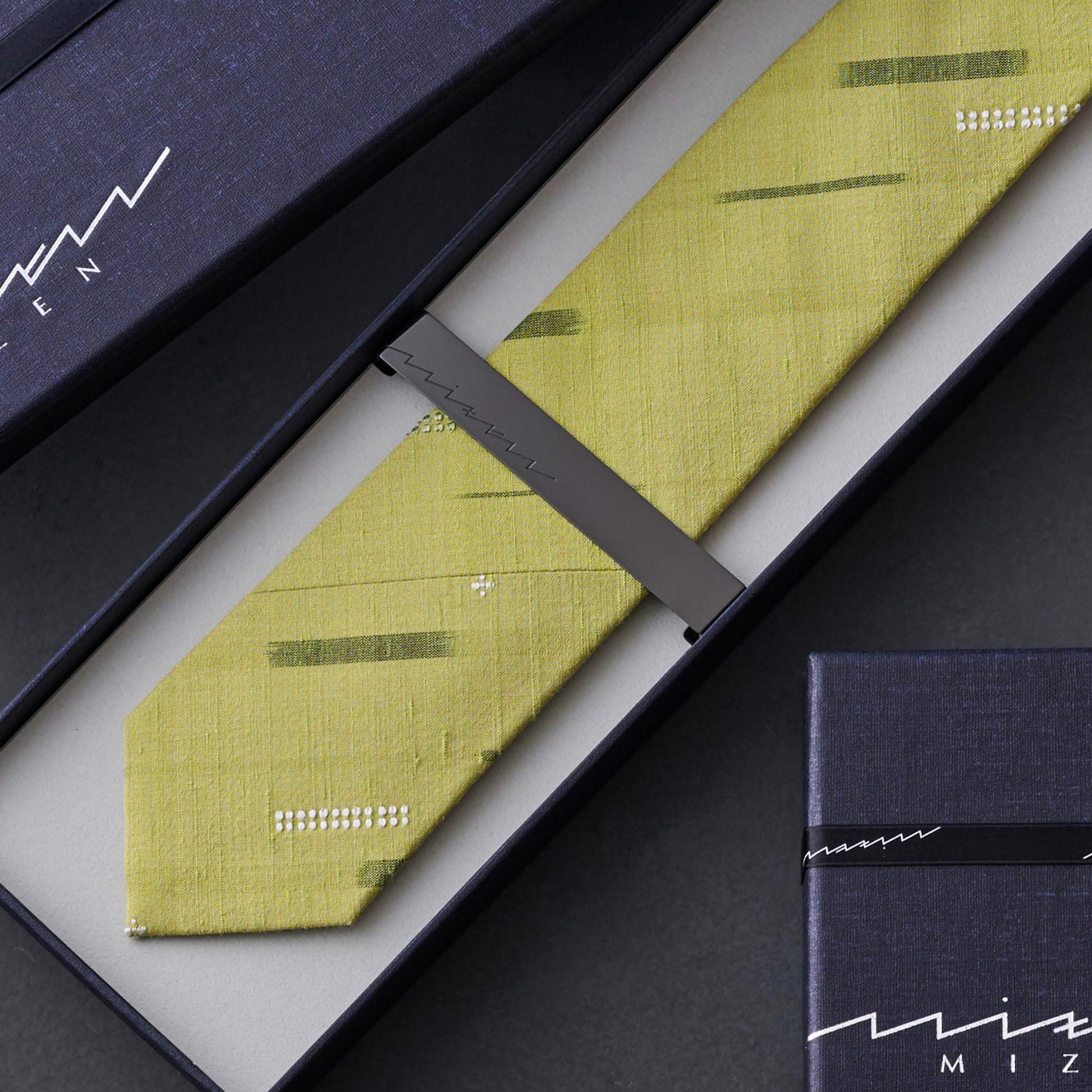 一般的にネクタイは、生地のタテ方向に対して45度のバイアス方向に配置して裁断をするため、生地巾が狭いと縫い目が多く効率的ではないため、着物の反物での作成は一般的ではありません。しかしながらMIZENは、より多くの人に活用いただける着物生地のタイを作成できないか思案した結果、着物から仕立てられていることの証として、最も眼に映る場所に縫い目を斜めのカット(スラッシュ)として配することで、MIZENのタイとして発表しました(商標登録済)。これも、手仕事の賜物である着物をネクタイとして世に出したいという、技術を主役としたMIZENの思想を表現しています。