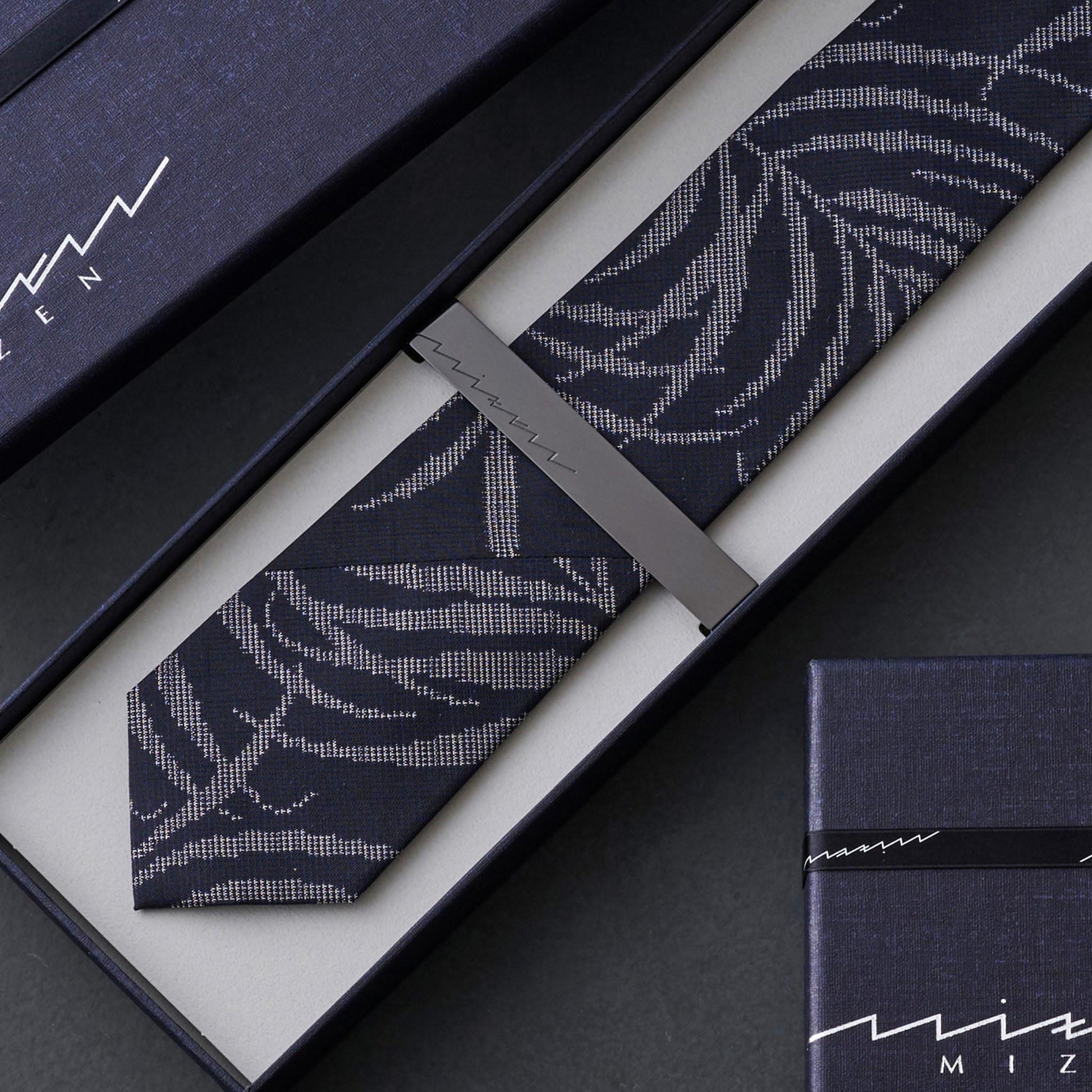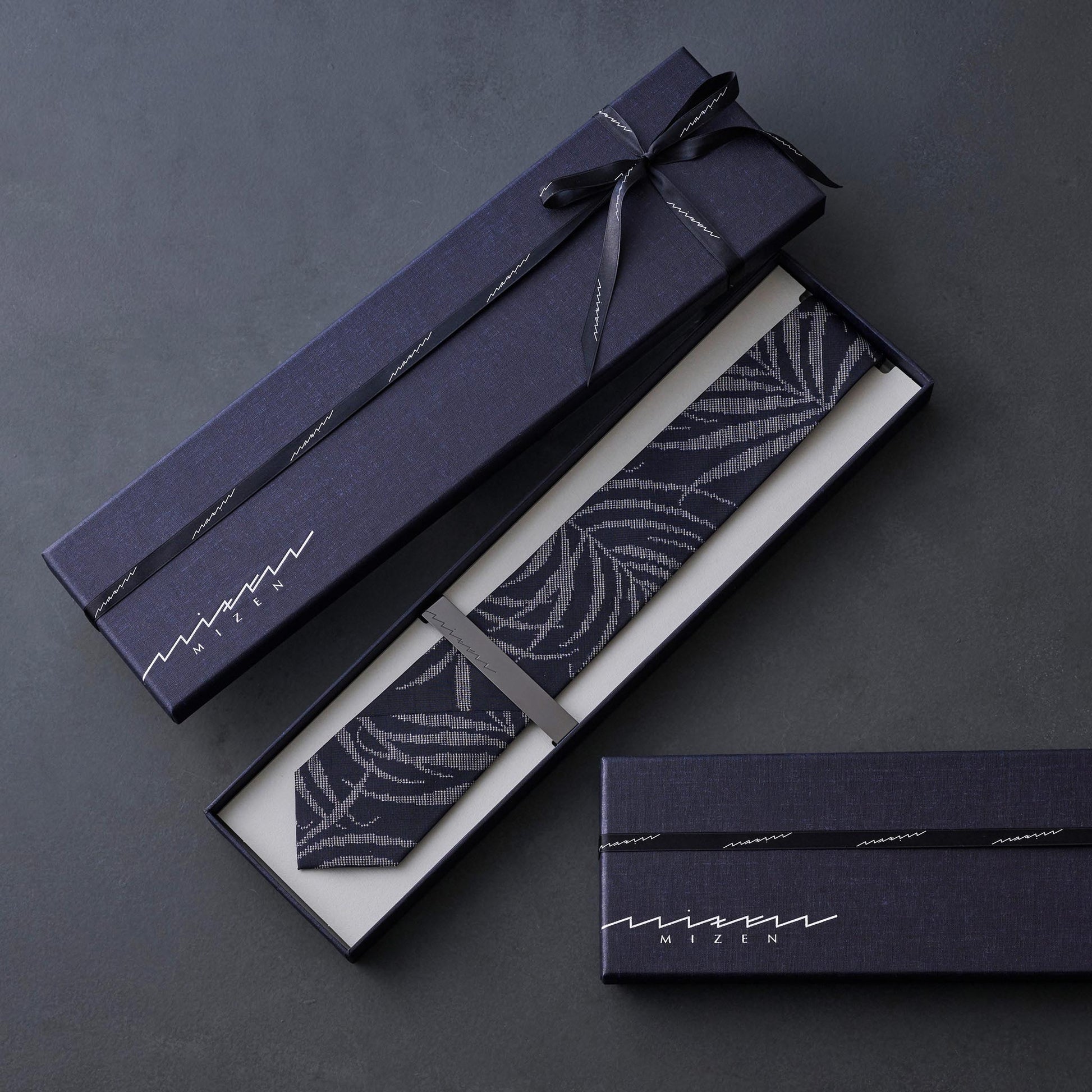 一般的にネクタイは、生地のタテ方向に対して45度のバイアス方向に配置して裁断をするため、生地巾が狭いと縫い目が多く効率的ではないため、着物の反物での作成は一般的ではありません。しかしながらMIZENは、より多くの人に活用いただける着物生地のタイを作成できないか思案した結果、着物から仕立てられていることの証として、最も眼に映る場所に縫い目を斜めのカット(スラッシュ)として配することで、MIZENのタイとして発表しました(商標登録済)。これも、手仕事の賜物である着物をネクタイとして世に出したいという、技術を主役としたMIZENの思想を表現しています。