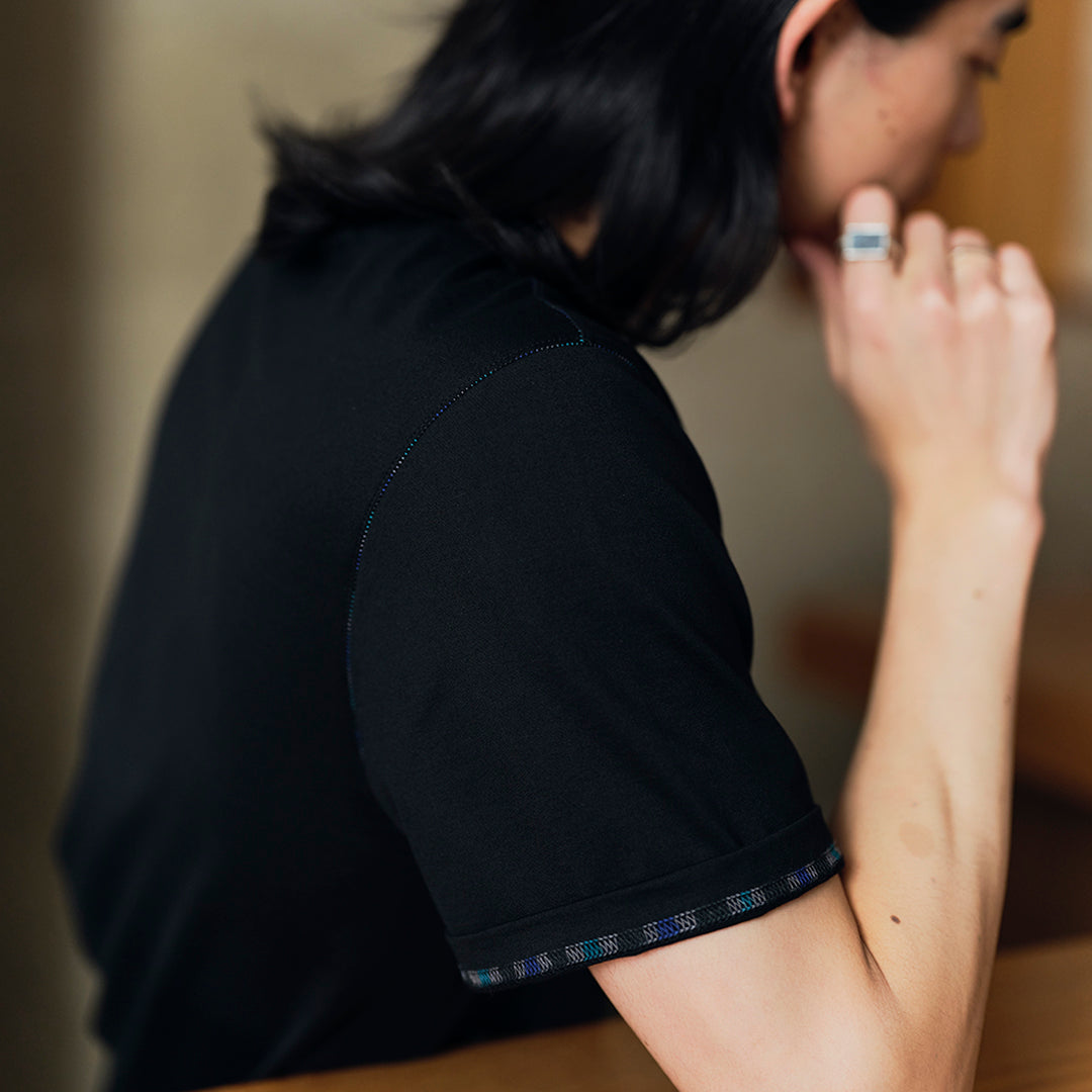 さらに、気仙沼・本吉スーツの高度な“リンキング”技術を融合。衿ぐりの内側にはニット仕立ての縫い代隠しを添え、その押さえにも絣糸を用いることで、環状に走るステッチがさりげない装飾として息づいています。