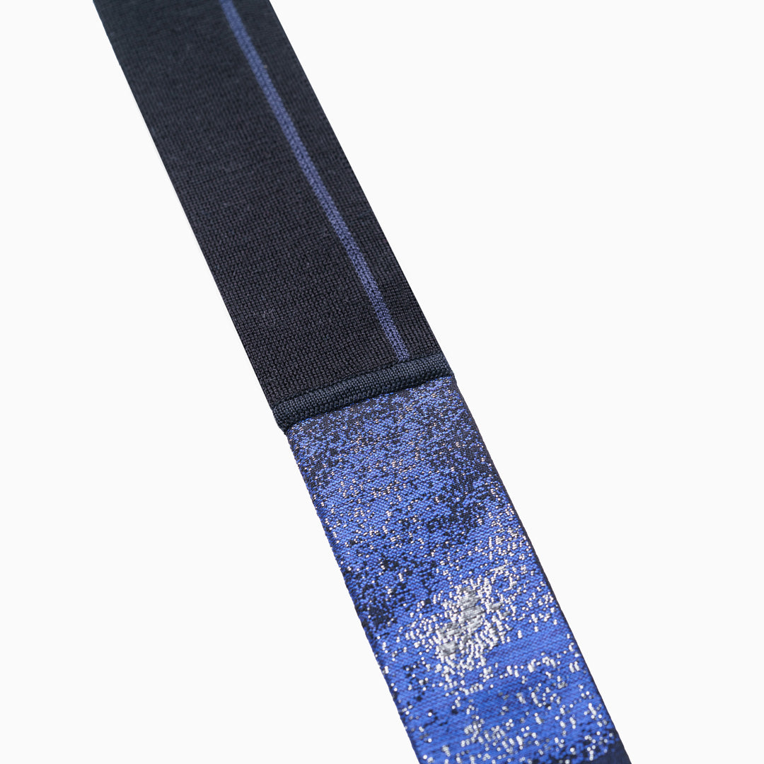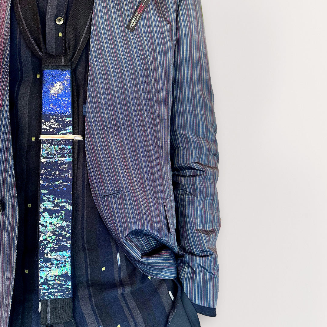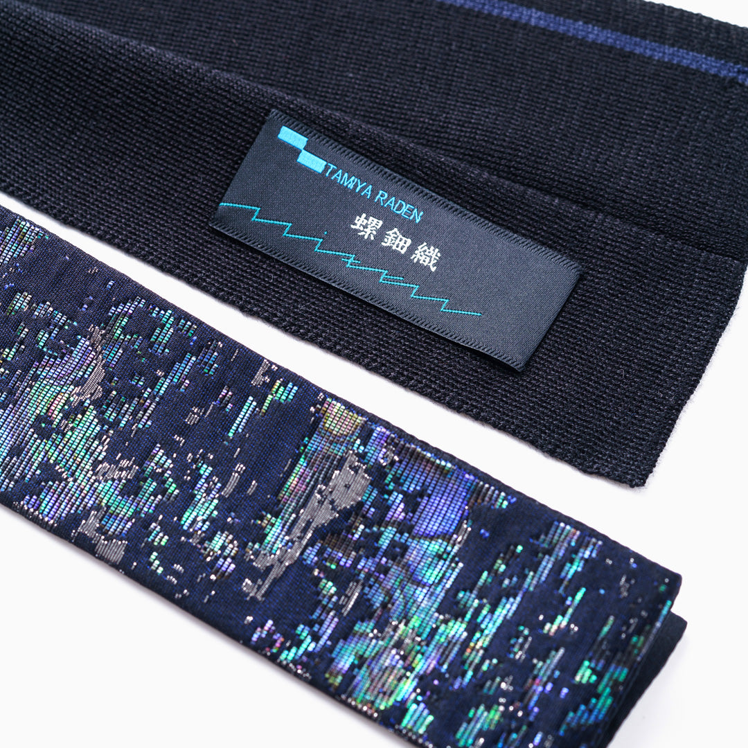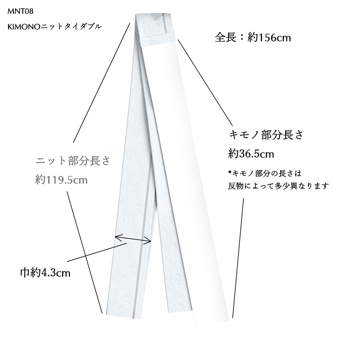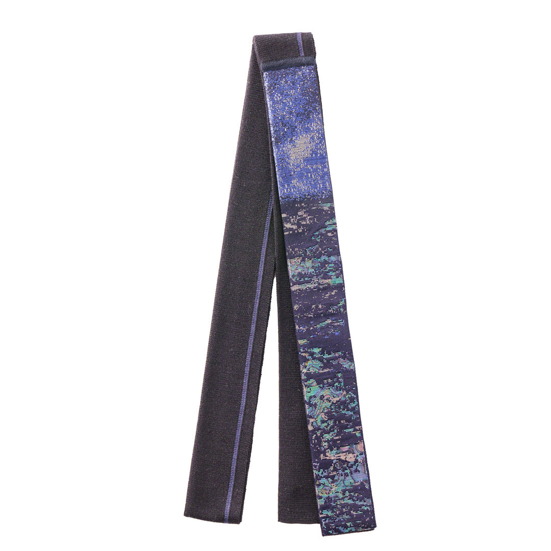 This tie is made by combining a kimono obi and knit with knit piping and folding it in half.