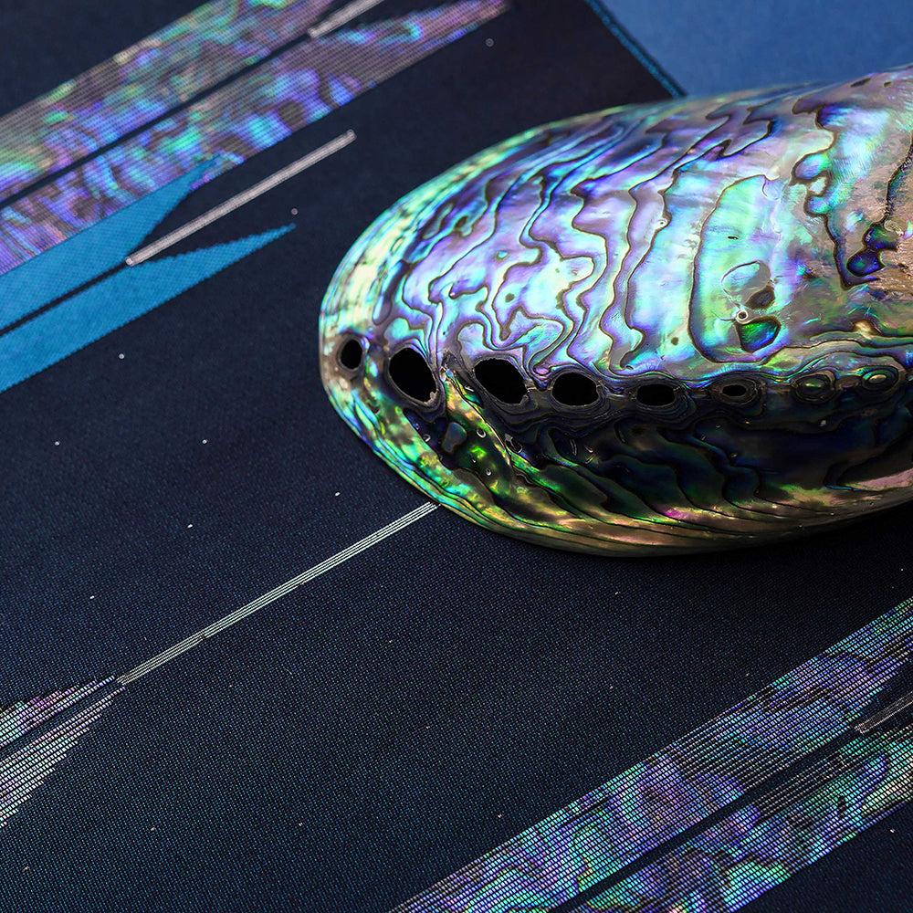 This product uses mother-of-pearl weaving, in which the surface of a partially carved shell is woven into the weft.