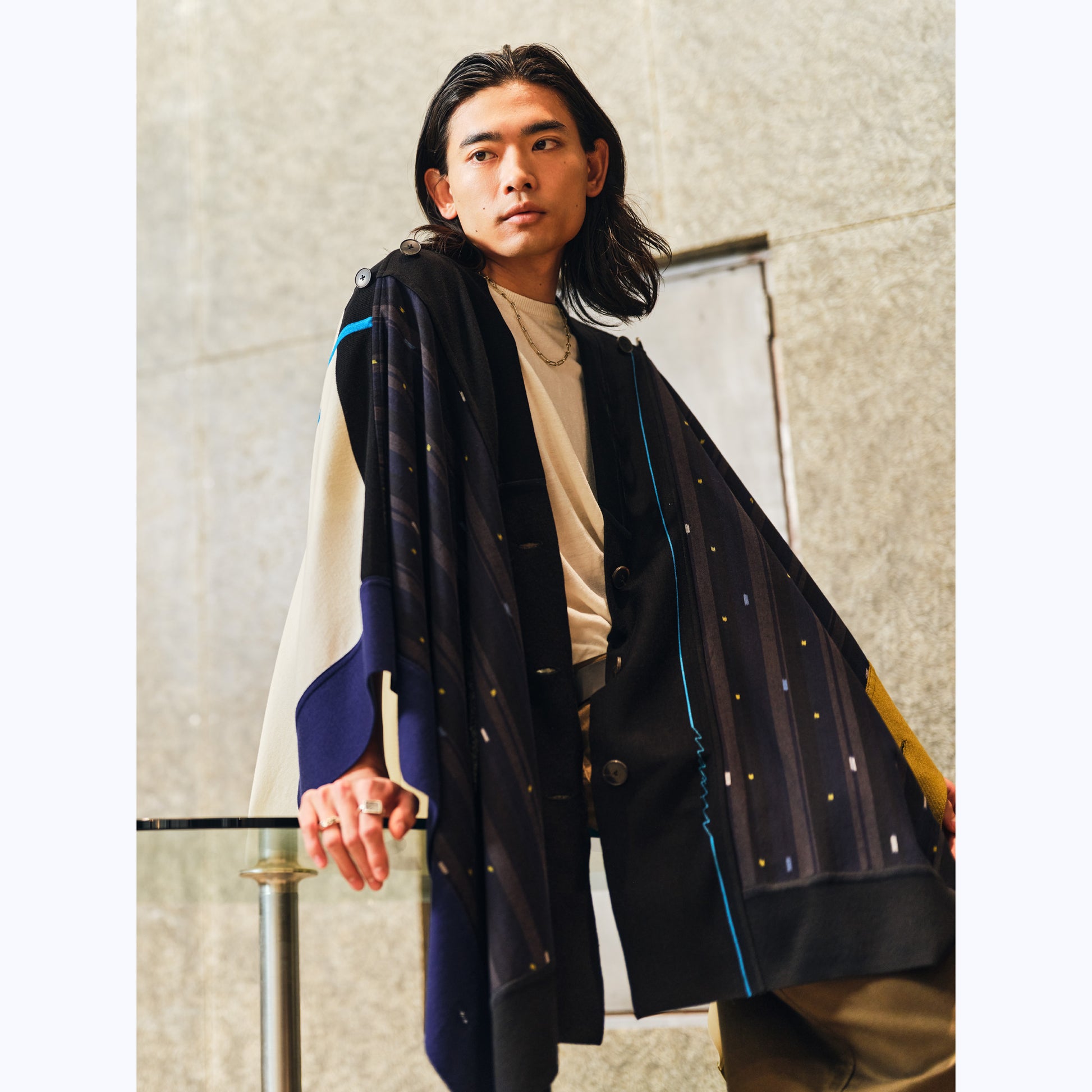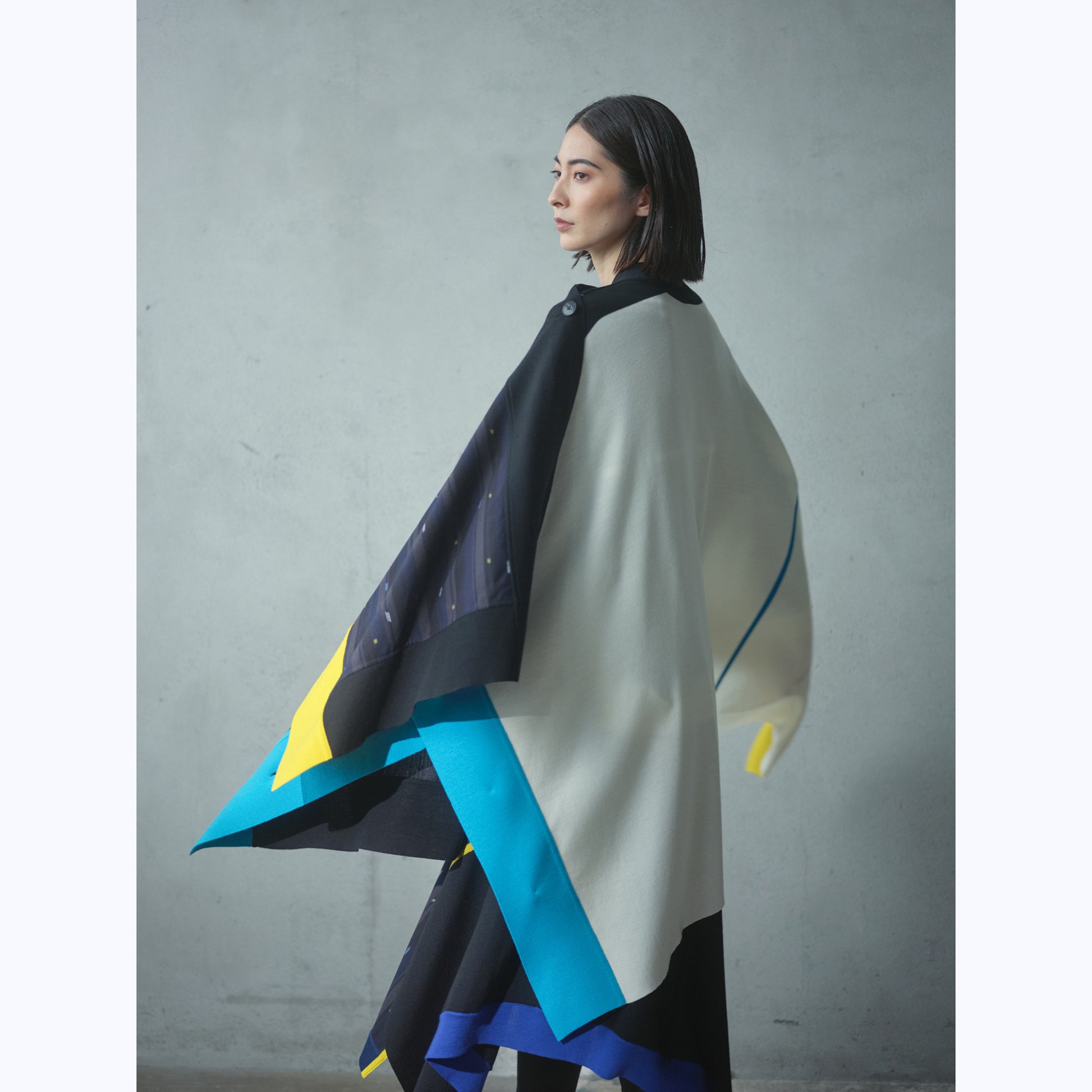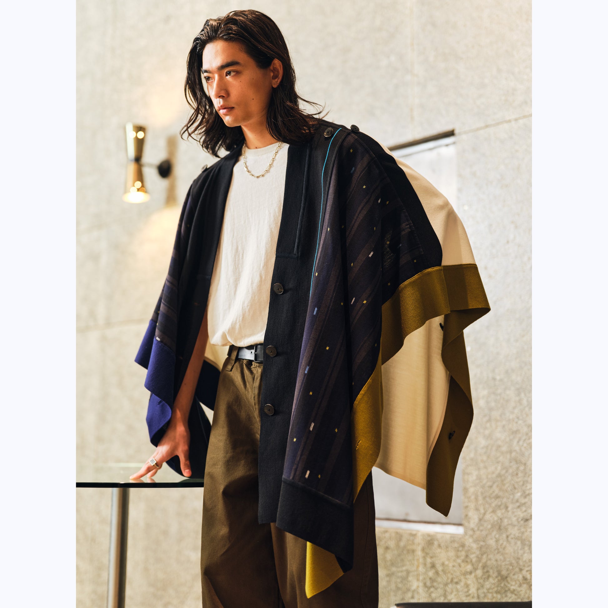 KIMONOニットスクエアケープは、伸縮性のあるニットと伸びない着物という異素材を、最高峰の縫製技術であるリンキングで融合させた一着です。全国共通となる着物の生地巾を利用し、どの産地の反物でも成立するように設計された構造的普遍性が評価されて、2024年グッドデザイン賞を受賞しました。デザインを主役に据えるのではなく、素材や技術を活かすために形づくられたこのケープは、MIZENが掲げる「技術が主役」という思想を象徴しています。