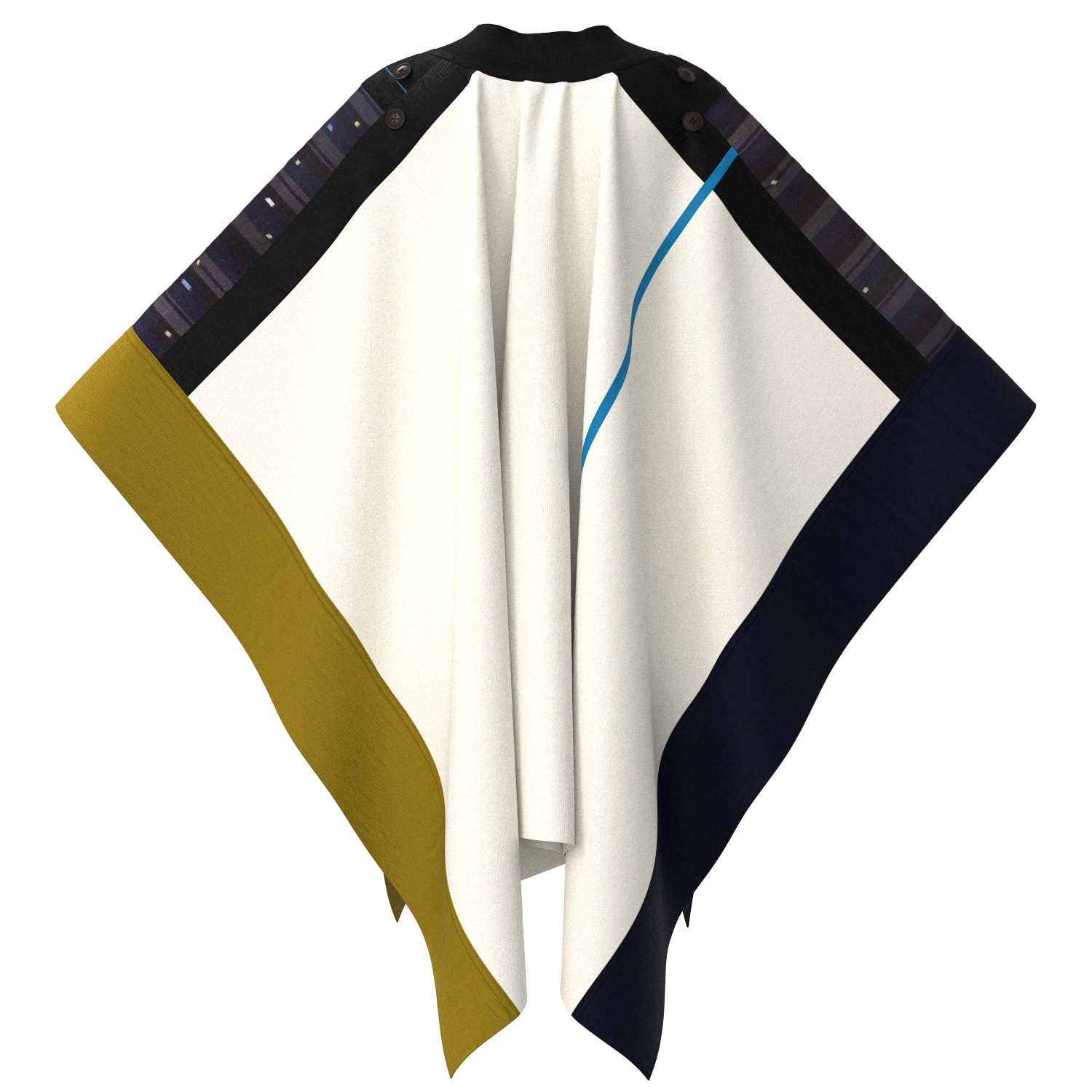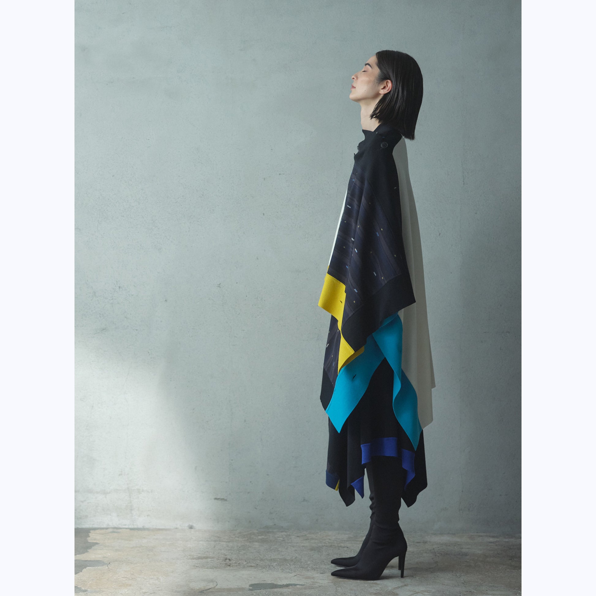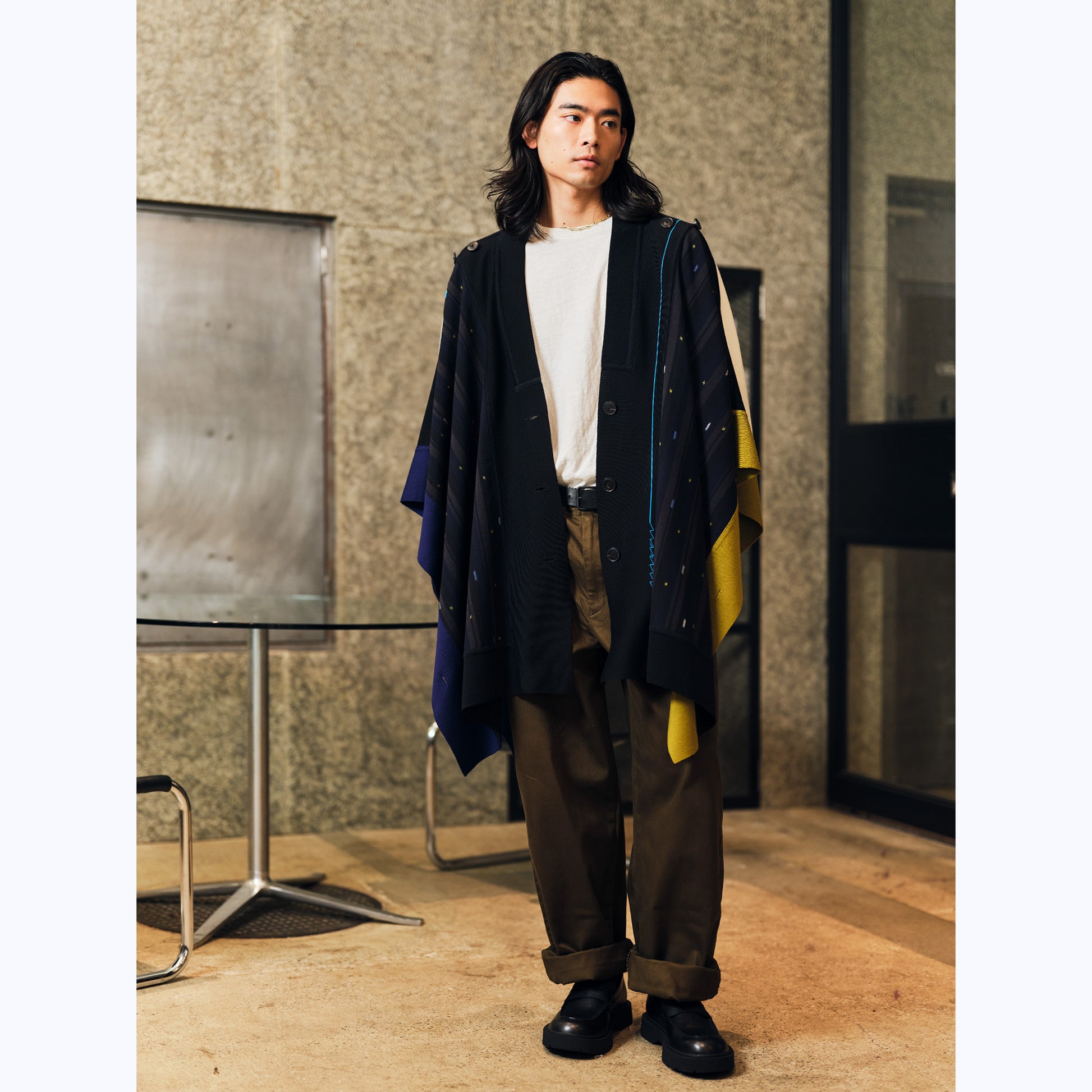 KIMONOニットスクエアケープは、伸縮性のあるニットと伸びない着物という異素材を、最高峰の縫製技術であるリンキングで融合させた一着です。全国共通となる着物の生地巾を利用し、どの産地の反物でも成立するように設計された構造的普遍性が評価されて、2024年グッドデザイン賞を受賞しました。デザインを主役に据えるのではなく、素材や技術を活かすために形づくられたこのケープは、MIZENが掲げる「技術が主役」という思想を象徴しています。