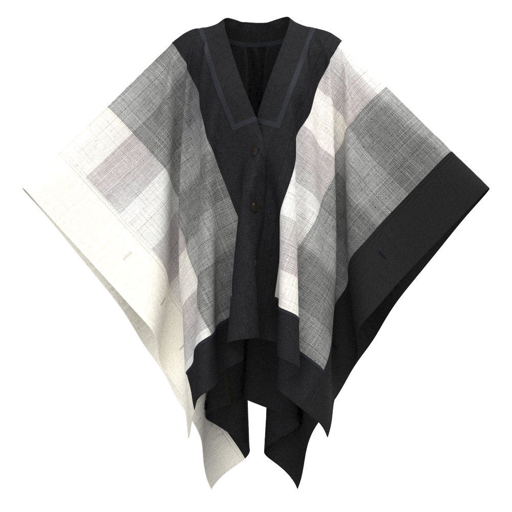 着物の反物の形状をそのままに活かしながらニットと組み合わせた大判ケープで、羽織りのようなシルエットが特徴。左右の肩に付いた4つの釦や前立て、袖口のボタンホールを使って、フリーサイズで様々な着方もできるユニセックスなデザイン。着物の上にも洋服の上にも着用可能。