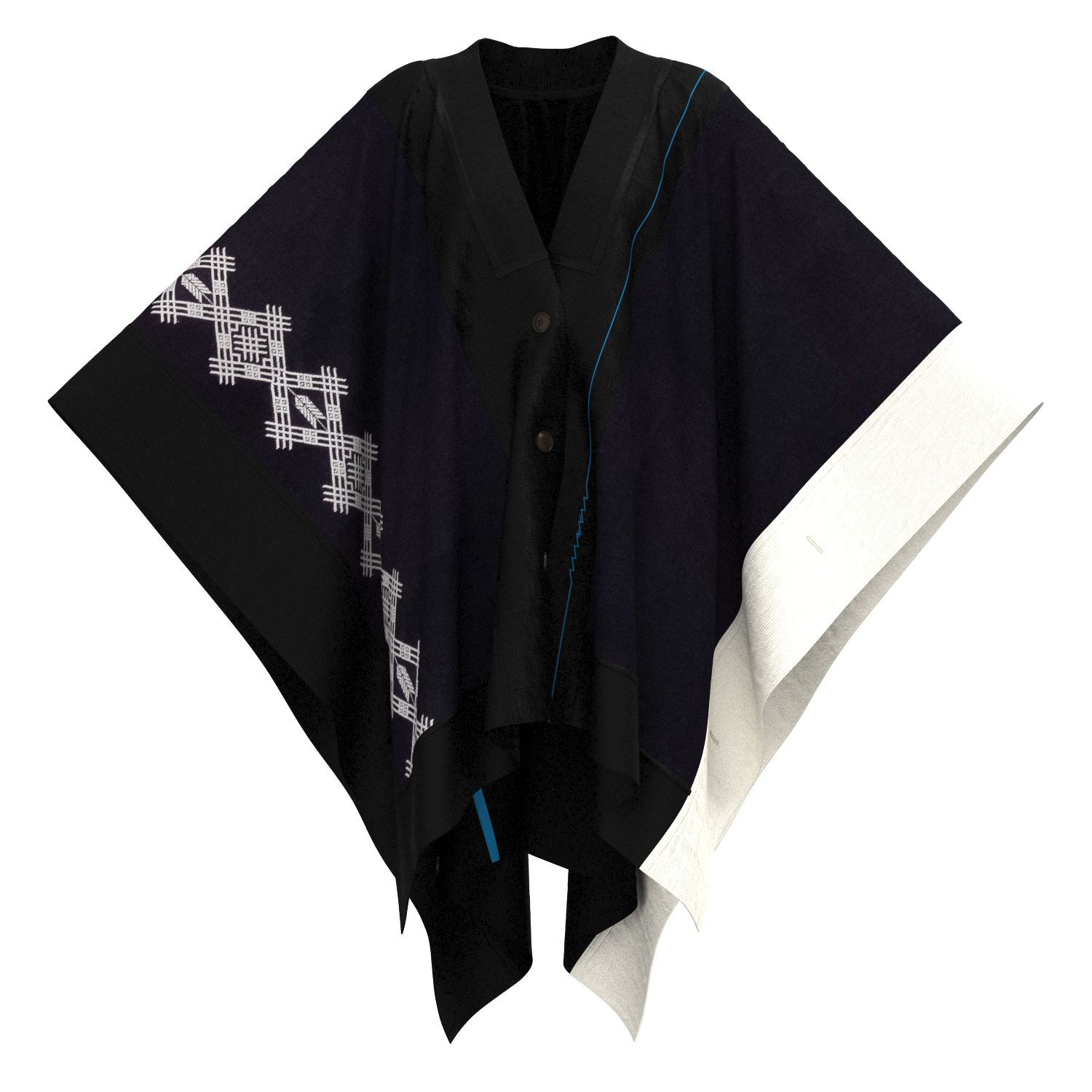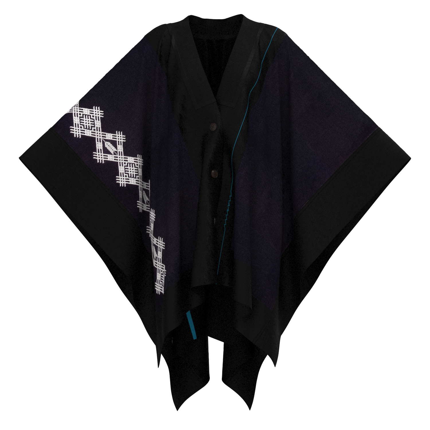 着物の反物の形状をそのままに活かしながらニットと組み合わせた大判ケープで、羽織りのようなシルエットが特徴。左右の肩に付いた4つの釦や前立て、袖口のボタンホールを使って、フリーサイズで様々な着方もできるユニセックスなデザイン。着物の上にも洋服の上にも着用可能。