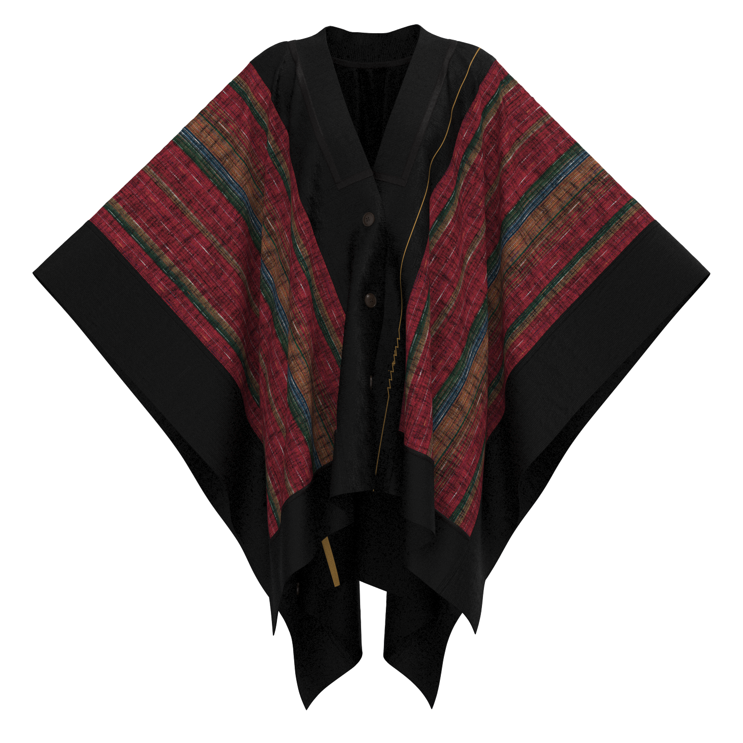 着物の反物の形状をそのままに活かしながらニットと組み合わせた大判ケープで、羽織りのようなシルエットが特徴。左右の肩に付いた4つの釦や前立て、袖口のボタンホールを使って、フリーサイズで様々な着方もできるユニセックスなデザイン。着物の上にも洋服の上にも着用可能。