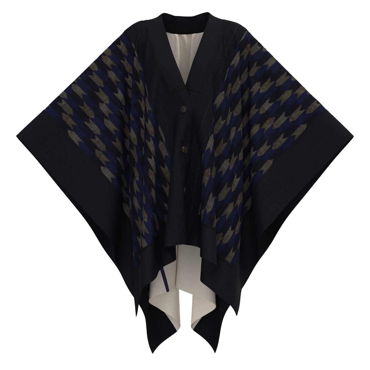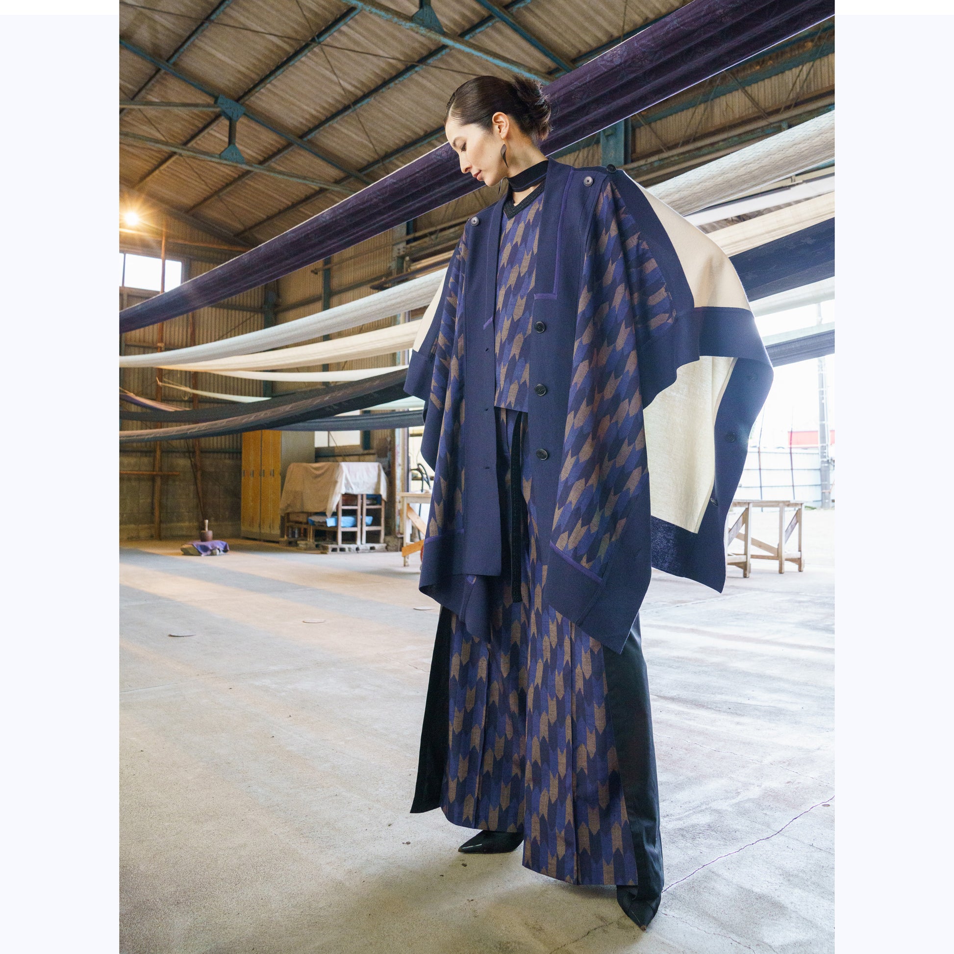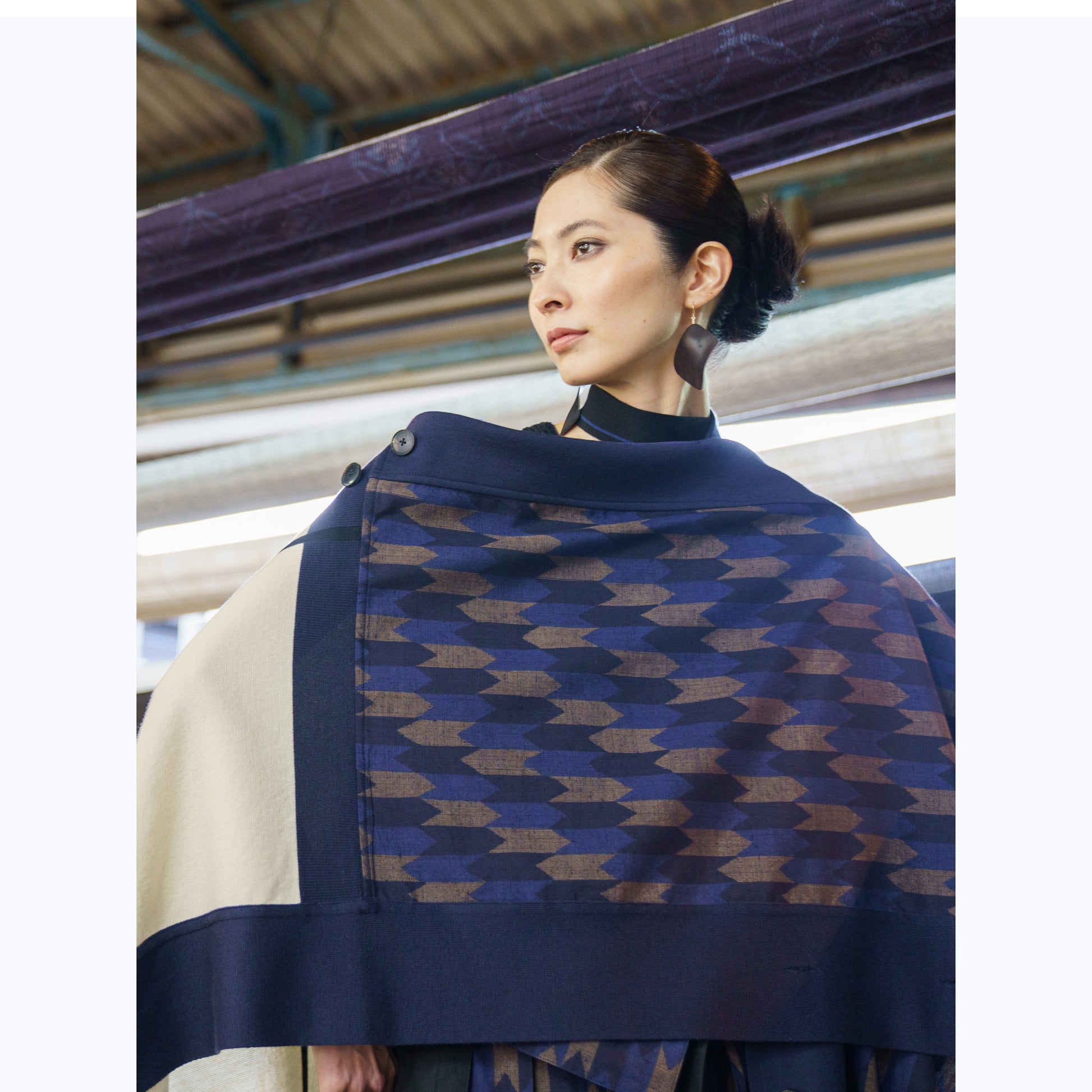 着物の反物の形状をそのままに活かしながらニットと組み合わせた大判ケープで、羽織りのようなシルエットが特徴。左右の肩に付いた4つの釦や前立て、袖口のボタンホールを使って、フリーサイズで様々な着方もできるユニセックスなデザイン。着物の上にも洋服の上にも着用可能。