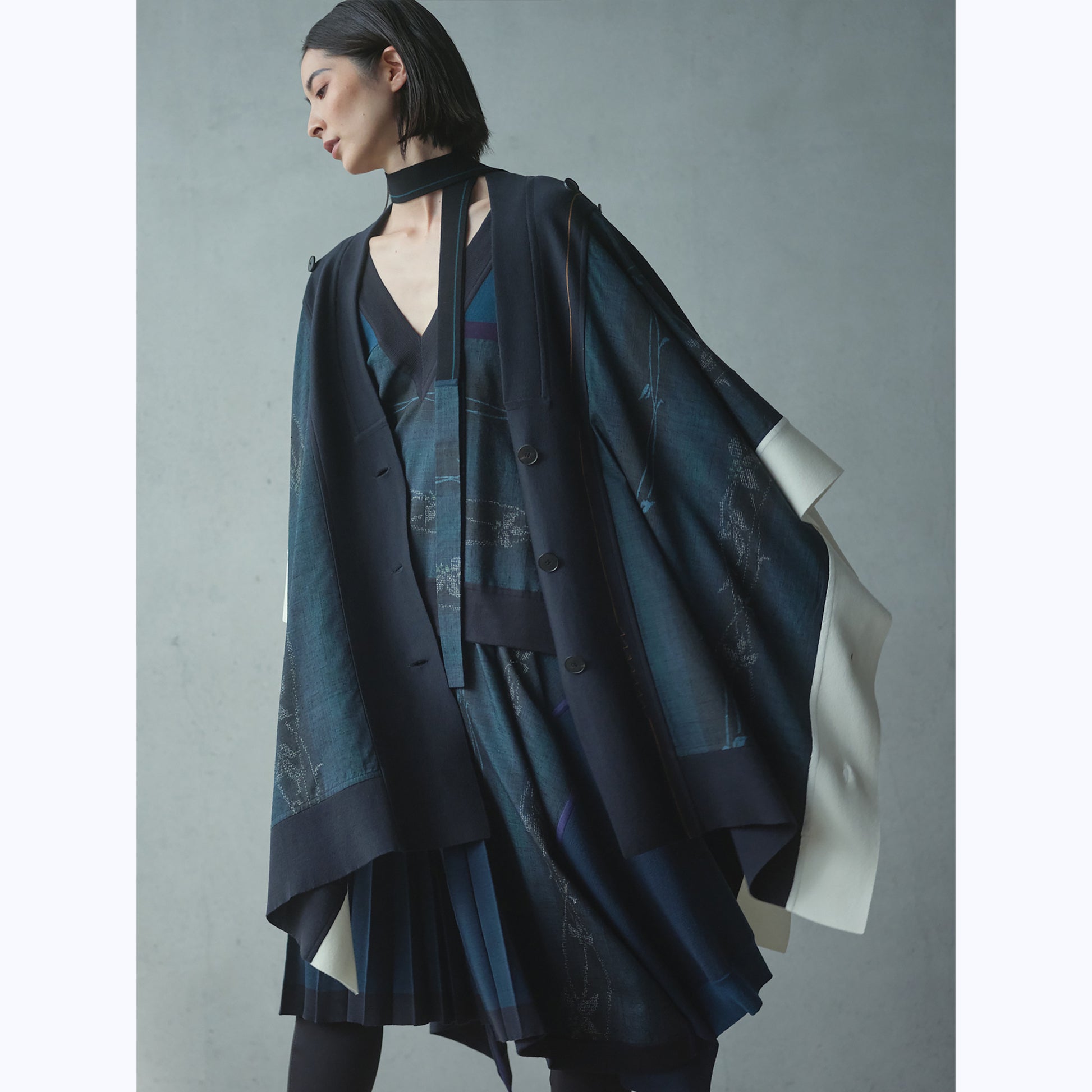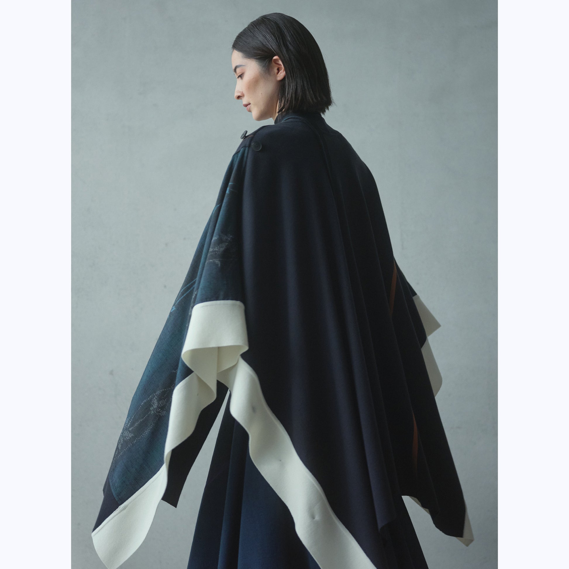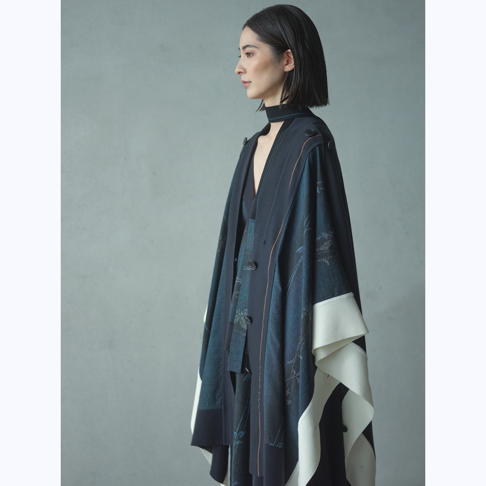 着物の反物の形状をそのままに活かしながらニットと組み合わせた大判ケープで、羽織りのようなシルエットが特徴。左右の肩に付いた4つの釦や前立て、袖口のボタンホールを使って、フリーサイズで様々な着方もできるユニセックスなデザイン。着物の上にも洋服の上にも着用可能。