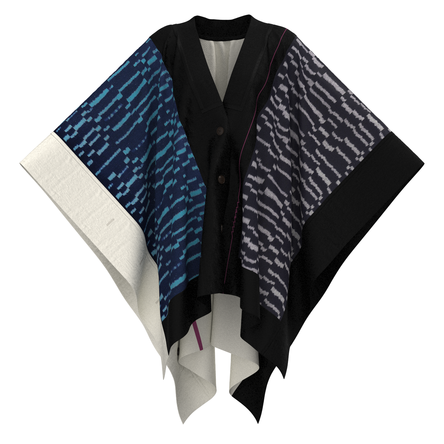 着物の反物の形状をそのままに活かしながらニットと組み合わせた大判ケープで、羽織りのようなシルエットが特徴。左右の肩に付いた4つの釦や前立て、袖口のボタンホールを使って、フリーサイズで様々な着方もできるユニセックスなデザイン。着物の上にも洋服の上にも着用可能。