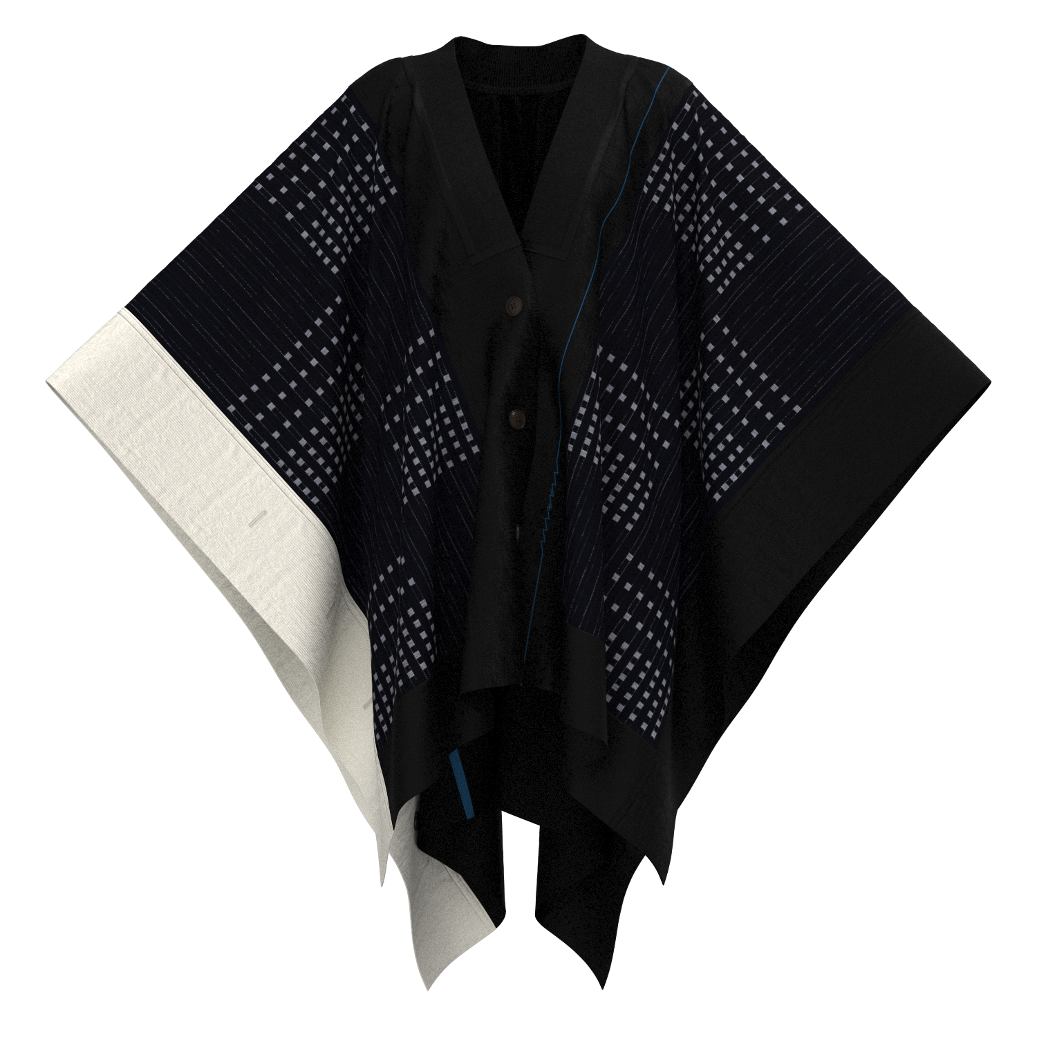 着物の反物の形状をそのままに活かしながらニットと組み合わせた大判ケープで、羽織りのようなシルエットが特徴。左右の肩に付いた4つの釦や前立て、袖口のボタンホールを使って、フリーサイズで様々な着方もできるユニセックスなデザイン。着物の上にも洋服の上にも着用可能。
