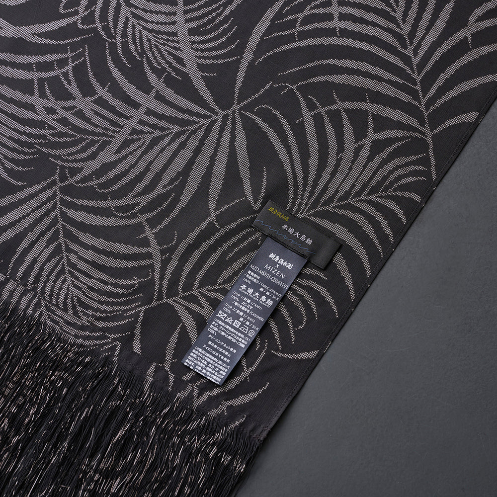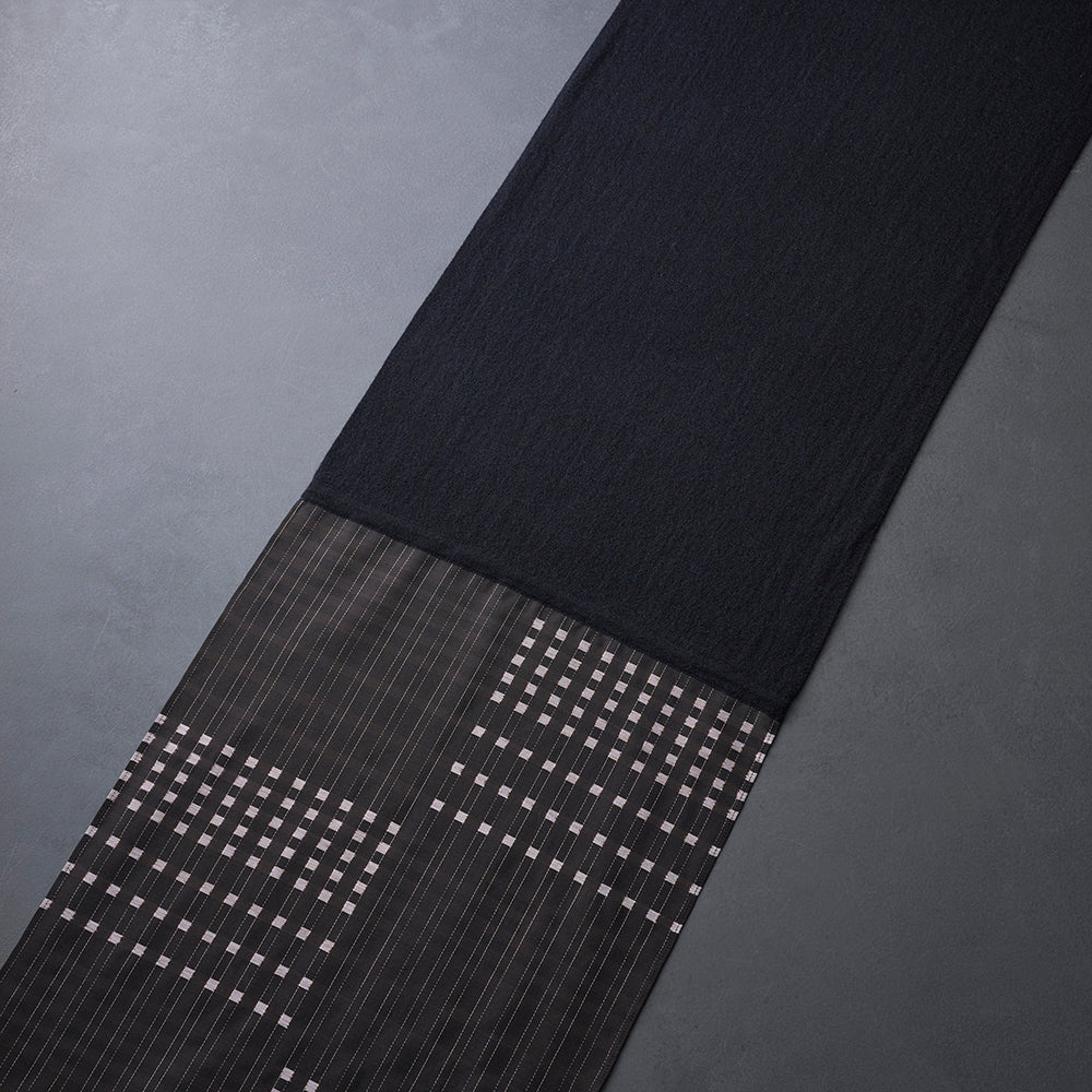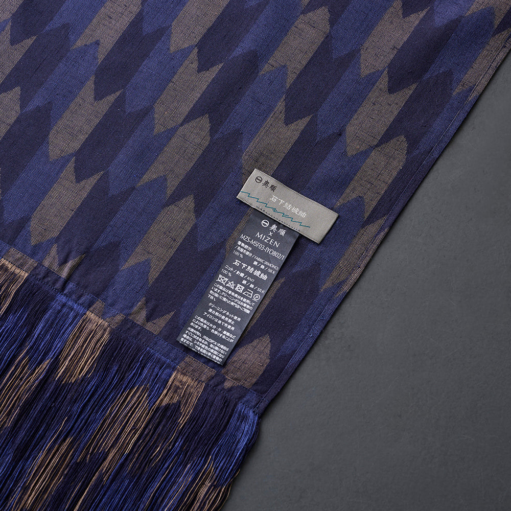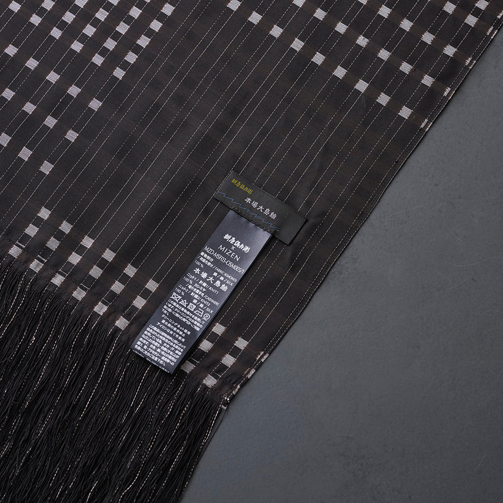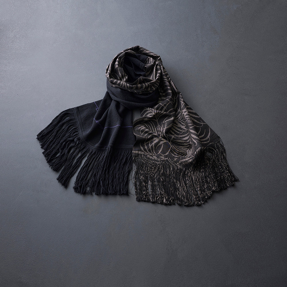 フリンジ付きのニットとキモノが半分ずつドッキングされた大判スカーフ。