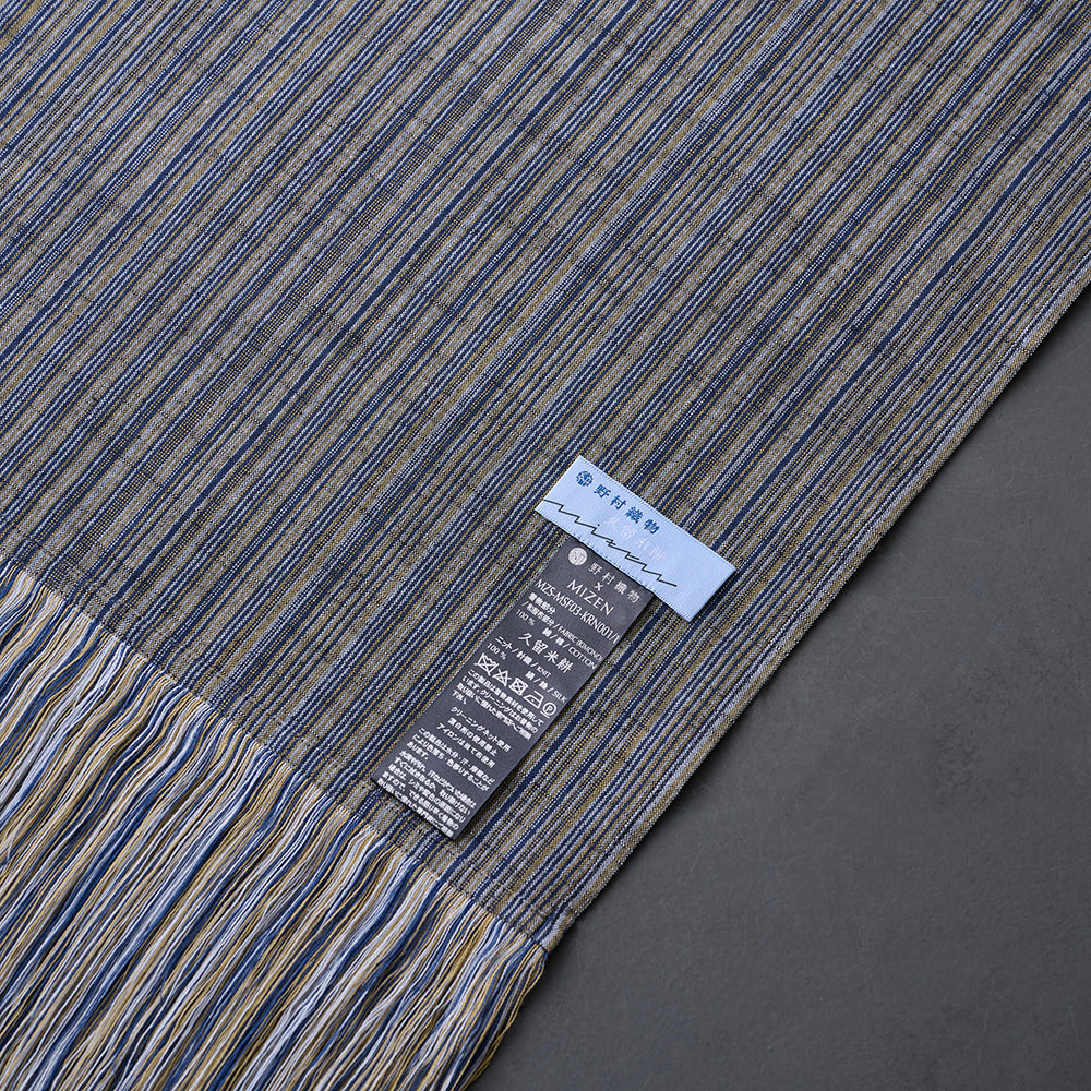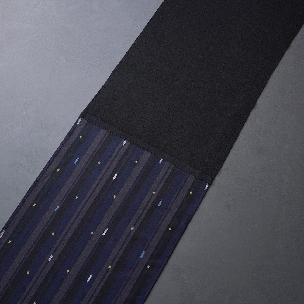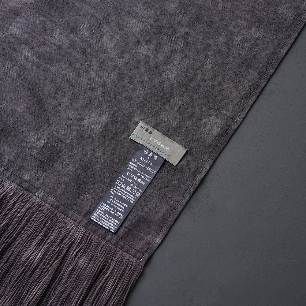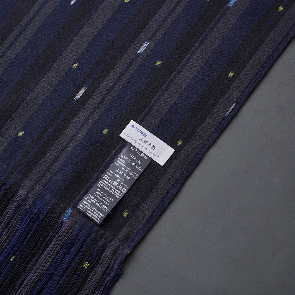 フリンジ付きのニットとキモノが半分ずつドッキングされた大判スカーフ。