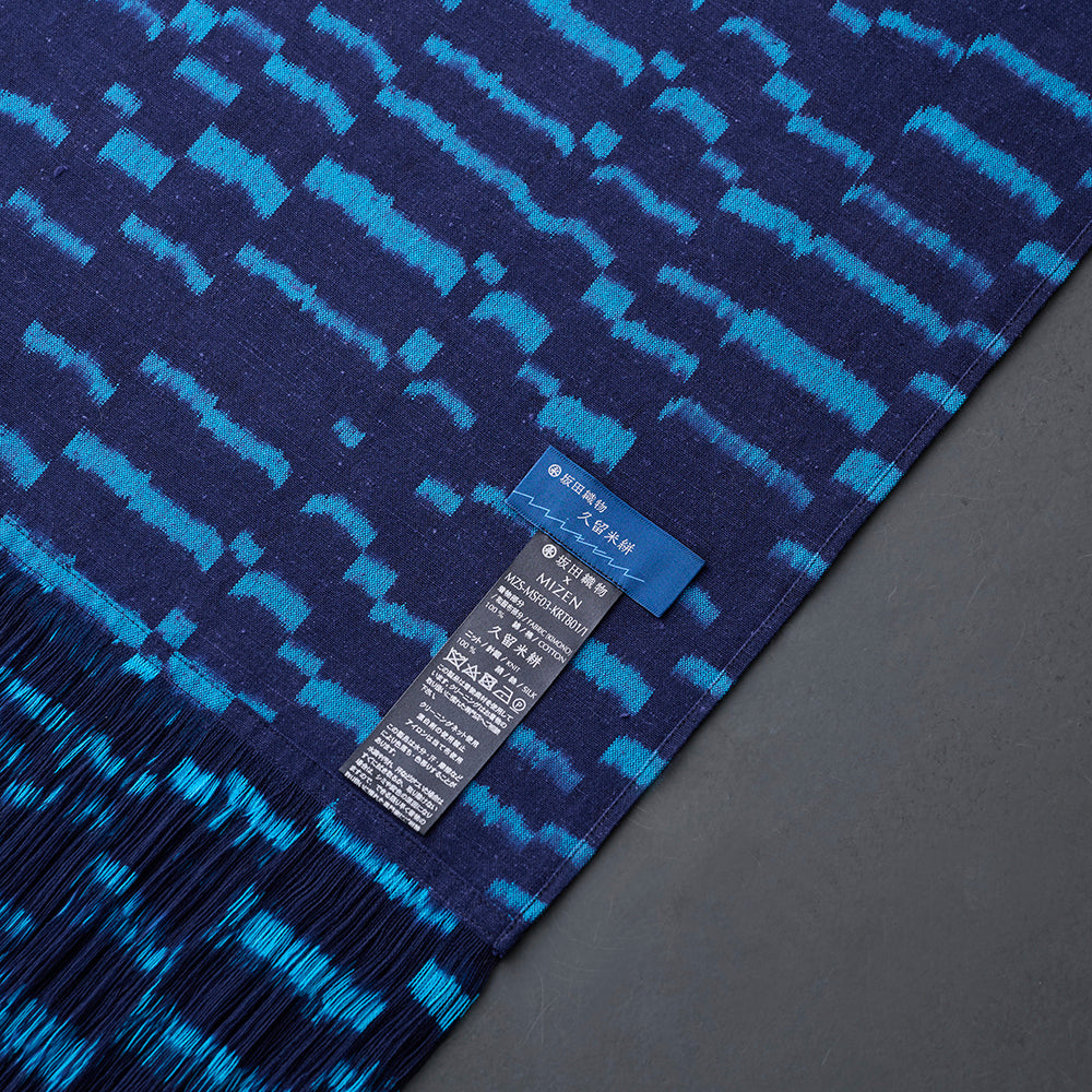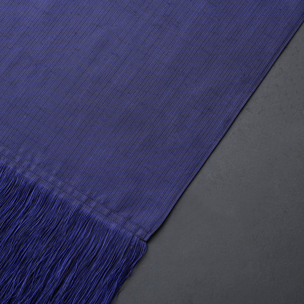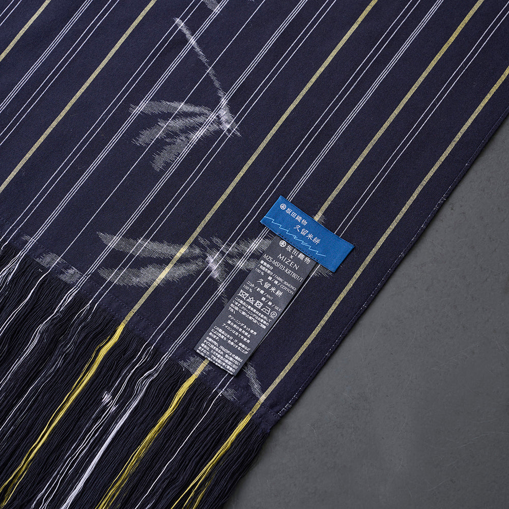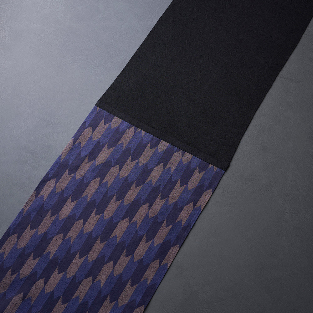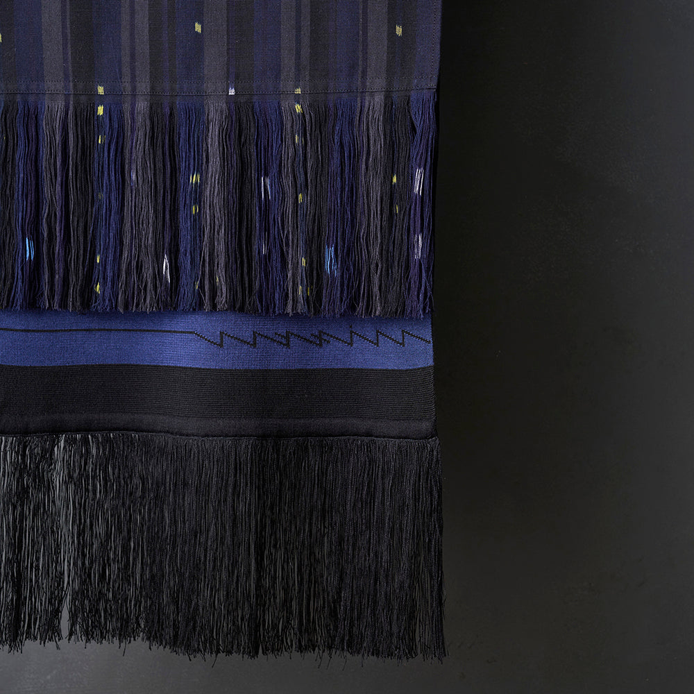 フリンジ付きのニットとキモノが半分ずつドッキングされた大判スカーフ。