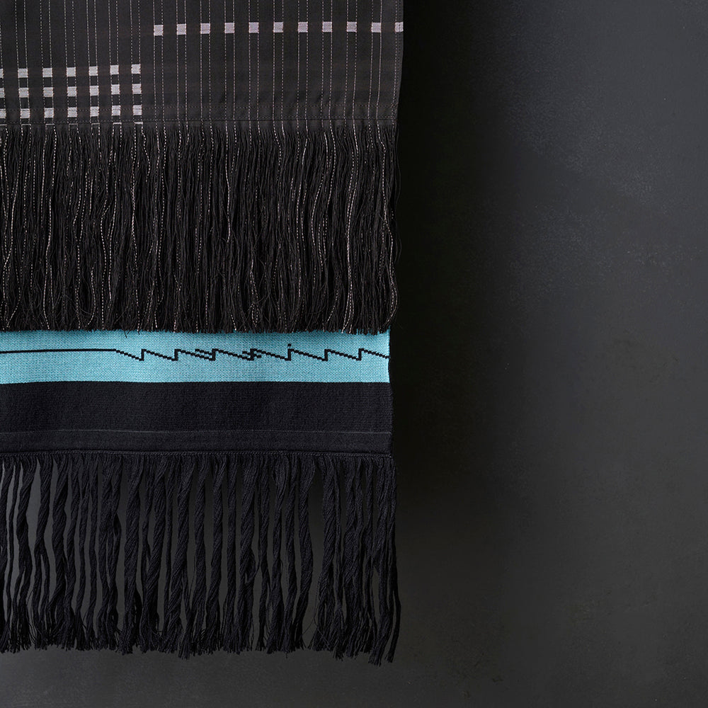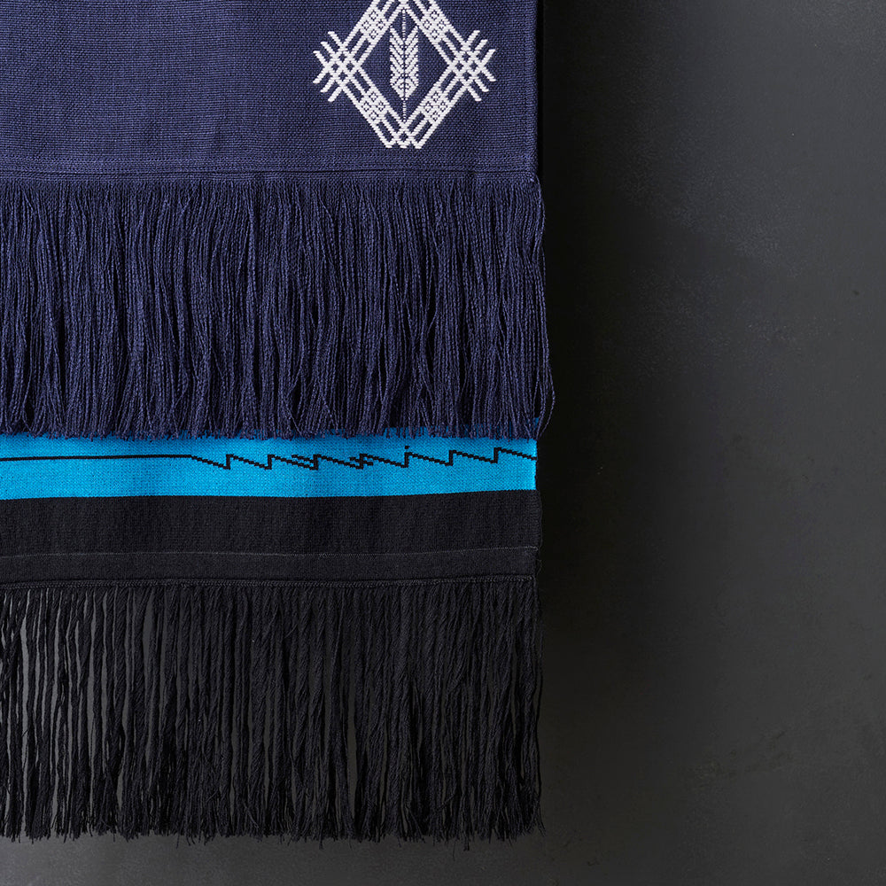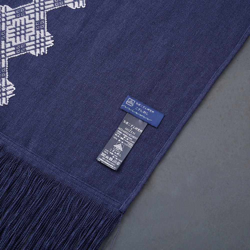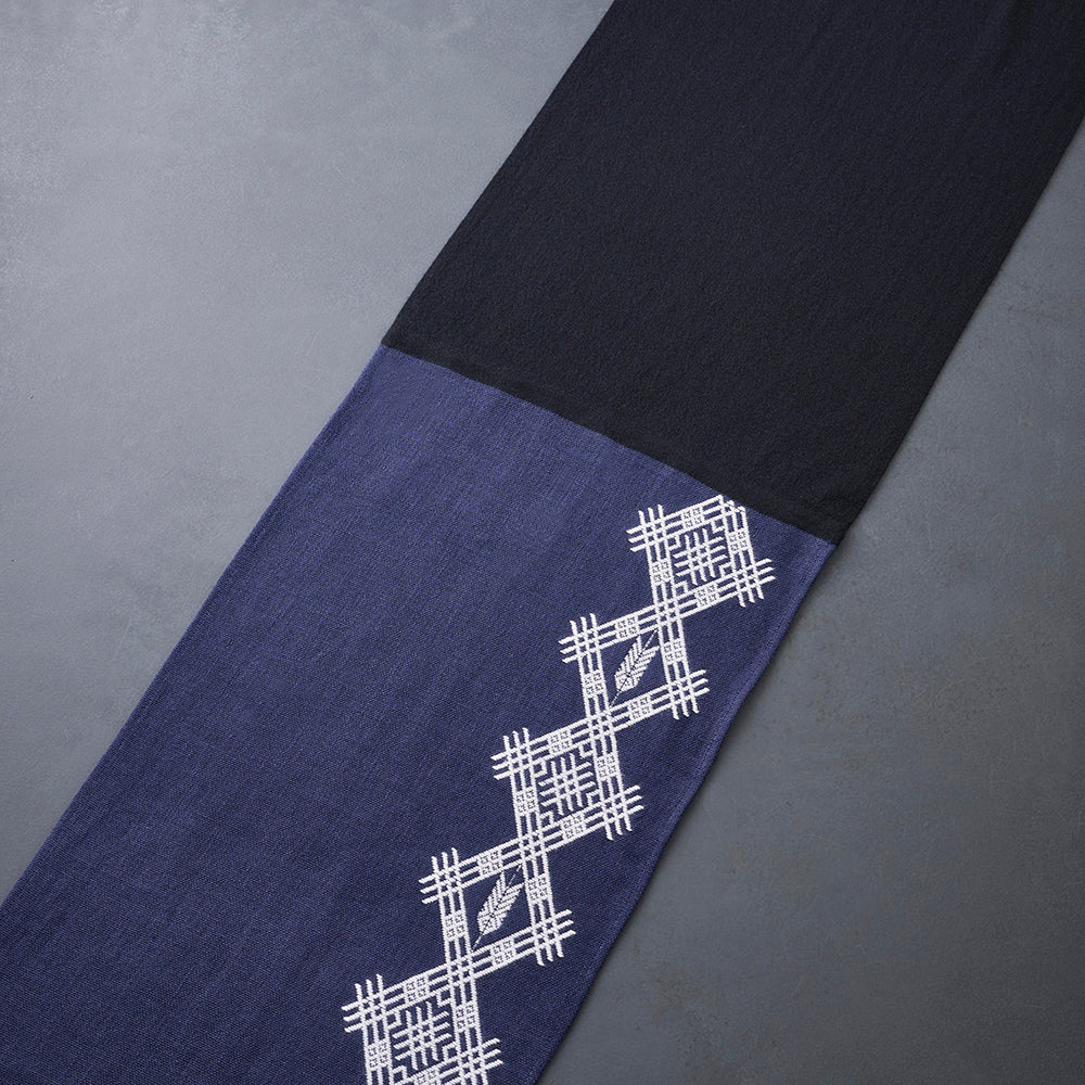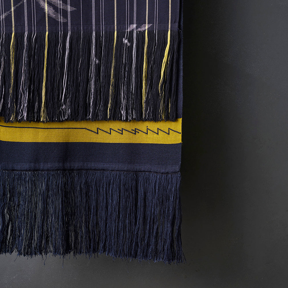 フリンジ付きのニットとキモノが半分ずつドッキングされた大判スカーフ。